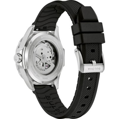 Cette montre Bulova a un boîtier Inox 41 mm en diamètre et est équipée d'un bracelet caoutchouc. Le boîtier contient un mouvement Miyota et la montre est dotée d'un cristal Saphire..