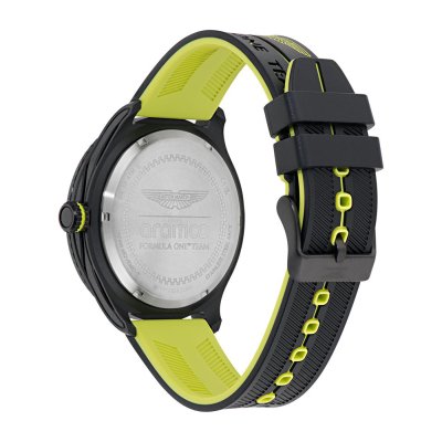 Diese Aston Martin Uhr hat ein Kunstharz Gehäuse mit einem Durchmesser von 46 mm und ist mit einem Armband aus Kautschuk versehen. In der Uhr arbeitet ein Timex Uhrwerk. Das Glas der Uhr besteht aus Mineral - Glas.