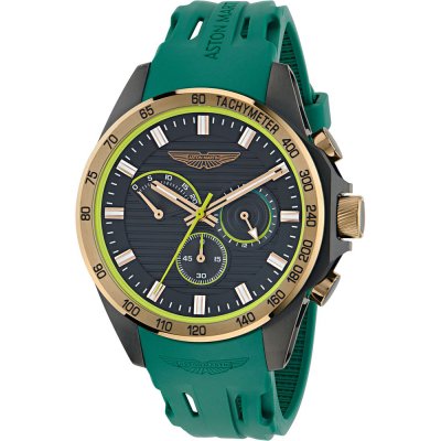 Diese Aston Martin Uhr hat ein Edelstahl Gehäuse mit einem Durchmesser von 44 mm und ist mit einem Armband aus Kautschuk versehen. In der Uhr arbeitet ein Seiko Instruments Inc. Uhrwerk. Das Glas der Uhr besteht aus Mineral - Glas.