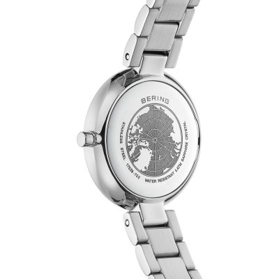 Diese Bering Uhr hat ein Edelstahl Gehäuse mit einem Durchmesser von 29 mm und ist mit einem Armband aus Edelstahl versehen. In der Uhr arbeitet ein Miyota Uhrwerk. Das Glas der Uhr besteht aus Sapphir - Glas.