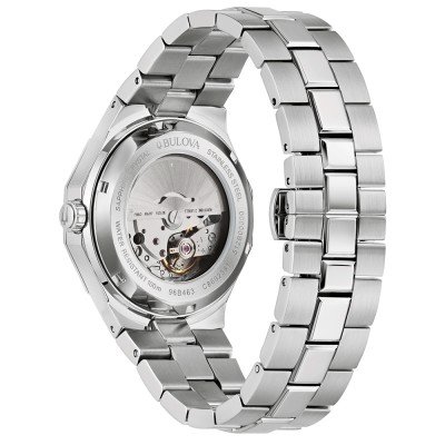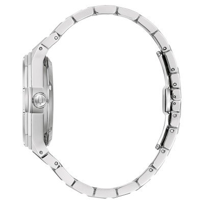 Diese Bulova Uhr hat ein Edelstahl Gehäuse mit einem Durchmesser von 40 mm und ist mit einem Armband aus Edelstahl versehen. In der Uhr arbeitet ein Miyota Uhrwerk. Das Glas der Uhr besteht aus Mineral - Glas.