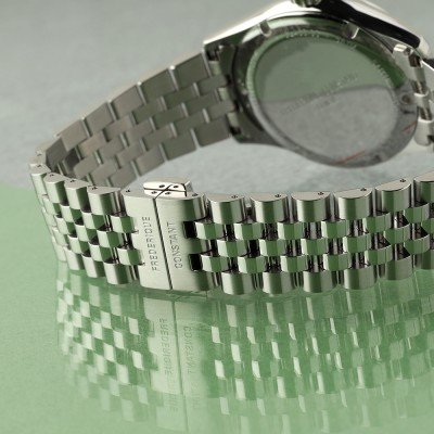 Diese Frederique Constant Uhr hat ein Edelstahl Gehäuse mit einem Durchmesser von 39 mm und ist mit einem Armband aus Edelstahl versehen. In der Uhr arbeitet ein Sellita Uhrwerk. Das Glas der Uhr besteht aus Sapphir - Glas.