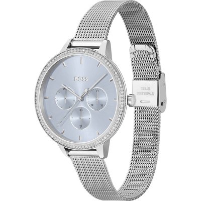 Diese Hugo Boss Uhr hat ein Edelstahl Gehäuse mit einem Durchmesser von 40 mm und ist mit einem Armband aus Edelstahl versehen. In der Uhr arbeitet ein Miyota Uhrwerk. Das Glas der Uhr besteht aus Mineral - Glas.