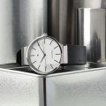 Diese Jacob Jensen Uhr hat ein Edelstahl Gehäuse mit einem Durchmesser von 39 mm und ist mit einem Armband aus Kautschuk versehen. In der Uhr arbeitet ein Ronda Uhrwerk. Das Glas der Uhr besteht aus Mineral - Glas.