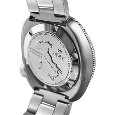 Im Mittelmeer vor der ligurischen Küste sind viele Schildkrötenarten zu finden. Die Form ihres Schildes inspirierte das Design der Uhr Ligure Tartaruga. Wie bei einem Schildkrötenschild überschneidet sich das Gehäuse leicht mit dem Hals bzw. in diesem Fall mit dem Armband, was der Uhr ihr unverwechselbares Aussehen verleiht. Ein weiteres typisches Merkmal der Ligure-Uhren sind die applizierten Indexe, die mit Swiss Super LumiNova X-grade gefüllt sind und einen, technisch sehr schwierig auszuführenden, roten Farbakzent aufweisen. Ergänzt werden die Indexe durch robuste, schwertförmige Zeiger im gleichen Stil. Reisen Sie stilvoll nach 'Bella Italia' mit dieser praktischen und raffinierten Taucheruhr.