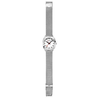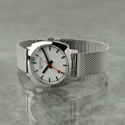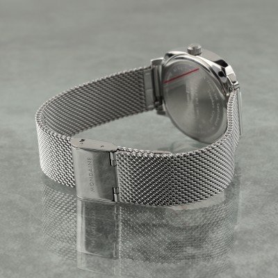 Diese Mondaine Uhr hat ein Edelstahl Gehäuse mit einem Durchmesser von 31 mm und ist mit einem Armband aus Edelstahl versehen. In der Uhr arbeitet ein Ronda Uhrwerk. Das Glas der Uhr besteht aus Sapphir - Glas.