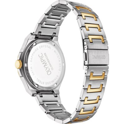 Diese Olympic Uhr hat ein Edelstahl Gehäuse mit einem Durchmesser von 44 mm und ist mit einem Armband aus Edelstahl versehen. In der Uhr arbeitet ein Miyota Uhrwerk. Das Glas der Uhr besteht aus Sapphir - Glas.