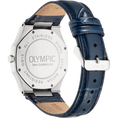 Diese Olympic Uhr hat ein Edelstahl Gehäuse mit einem Durchmesser von 40 mm und ist mit einem Armband aus Leder versehen. In der Uhr arbeitet ein Miyota Uhrwerk. Das Glas der Uhr besteht aus Mineral - Glas.