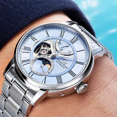 Diese auf 190 Exemplare limitierte Uhr M45 F7 basiert auf dem Design der 2017 erschienenen Mechanical Moon Phase. Die Moon Phase hat sich im Vergleich zum Original deutlich verändert. Der Hintergrund ist nun ein tiefblauer Nachthimmel, der die Sterne klarer und heller erscheinen lässt. Das wunderschön detaillierte Zifferblatt weist ein Muster aus dem Orient Star-Logo auf, das nur je nach Lichteinfall sichtbar ist. Da sich alle wichtigen Funktionen in der Mitte des geschichteten Zifferblatts befinden, sticht der äußere Ring mit den römischen Ziffern besonders hervor. Die beidseitige Entspiegelung des Saphirglases blockiert fast 99 Prozent der Reflexionen und sorgt so für eine gute Sicht aus jedem Blickwinkel.