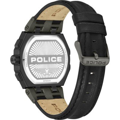 Diese Police Uhr hat ein Edelstahl Gehäuse mit einem Durchmesser von 45 mm und ist mit einem Armband aus Leder versehen. In der Uhr arbeitet ein Seiko Instruments Inc. Uhrwerk. Das Glas der Uhr besteht aus Mineral - Glas.