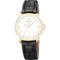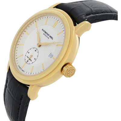 Diese Raymond Weil Uhr hat ein Edelstahl Gehäuse mit einem Durchmesser von 39.5 mm und ist mit einem Armband aus Leder versehen. In der Uhr arbeitet ein Sellita Uhrwerk. Das Glas der Uhr besteht aus Sapphir - Glas.