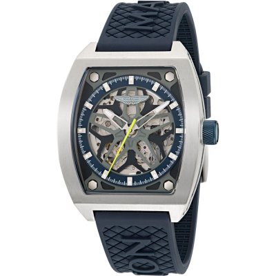 This Aston Martin watch has a case made of titanium with a diameter of 41 mm and is fitted with a rubber band. Inside the case lies a Timex movement and the watch features a Mineral crystal.