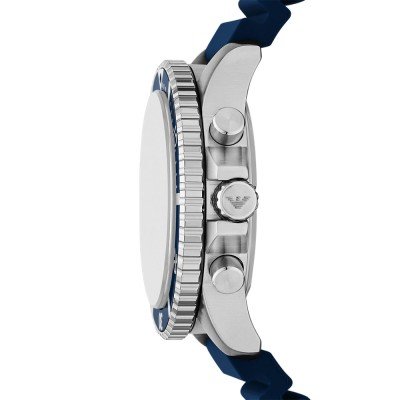 This Emporio Armani watch has a case made of stainless steel with a diameter of 43 mm and is fitted with a rubber band. Inside the case lies a Seiko movement and the watch features a Mineral crystal.