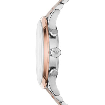 This Emporio Armani watch has a case made of stainless steel with a diameter of 44 mm and is fitted with a stainless steel band. Inside the case lies a Miyota movement and the watch features a Mineral crystal.