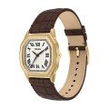 This Fossil watch has a case made of stainless steel with a diameter of 27 mm and is fitted with a leather band. Inside the case lies a Miyota movement and the watch features a Mineral crystal.