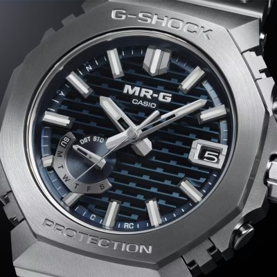 The dial of the MRG-B2100 at first glance might seem like a simple textured dark dial, but in fact, it has a 3D-texture based on a Japanese woodworking method called kigumi. This technique involves interlocking wooden parts without using metal fixtures. A seemingly simple construction featuring ingenious joints to create something truly special. The same goes for the MRG-B2100; Besides the beautifully crafted dial, the watch is a study in craftsmanship and combining of innovative materials. Assembled at Casio’s Premium Production Line in Yamagata, the case and (27 individual!) bezel components are made from the super-hard titanium alloy, Ti64. The bezel top is fashioned from COBARION, an alloy that is four times harder than pure titanium, and the bracelet is made of another special titanium alloy, DAT55G, which is both extremely hard and highly workable. With a case size of 44.4 × 49.5 × 13.6mm, it is an average size G-Shock, yet perfectly wearable, especially due to the lightweight materials, while the multi-guard construction of case and bezel ensures the watch is extra resistant to shocks. All the different watch parts have a diamond-like carbon (DLC) coating for even better scratch resistance. The watch is operated by Casio’s module 5718, which in addition to Multiband 6 radio controlled time adjustment, offers smartphone pairing via Bluetooth. Other functions include an automatic calendar until 2099, low-battery alert, and a Super Illuminator LED. Other app functions are automatic switching to summer time (DST), auto and one-touch time correction, phone finder, hand-alignment correction, and Time & Place log.