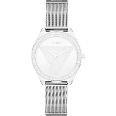 This Guess watch strap is made of metal and is attached to the watch by means of pushpins. The band has a width of 16 mm and is closed by means of a milanese clasp. The strap has no straight mount which means that this strap is only suitable for the watches listed below.