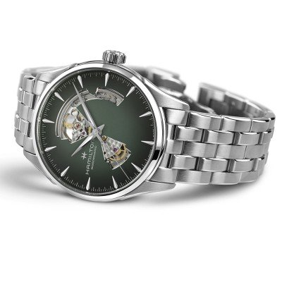 The Hamilton Jazzmaster Open Heart is more than just a watch. It offers a glimpse into its inner workings. The base plate of the H-10 automatic movement with 25 jewels and 80 hours power reserve has been carefully skeletonized and decorated with a perlage pattern. Showing off the movement through the apertures in the dial it is complemented by sharp cut Dauphine hands and indexes. Case and strap have both a brush finish with refined high gloss polished edges. The Hamilton Jazzmaster Open Heart is available in several colors and a choice of leather straps or stainless steel bracelet.