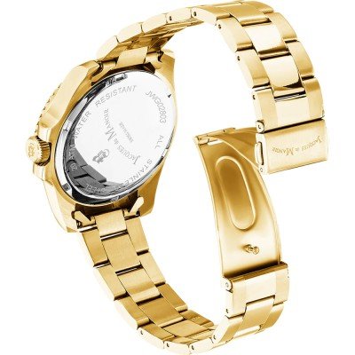 This Jacques du Manoir watch has a case made of stainless steel with a diameter of 43 mm and is fitted with a stainless steel band. Inside the case lies a Ronda movement and the watch features a Mineral crystal.