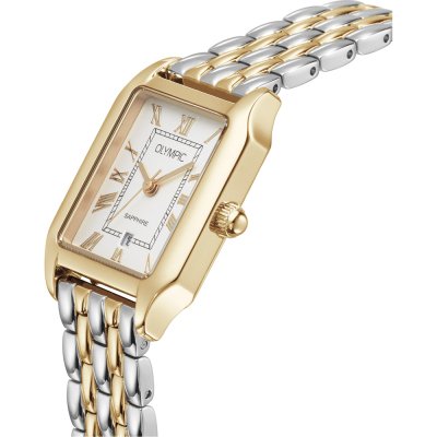 This Olympic watch has a case made of stainless steel with a diameter of 23 mm and is fitted with a stainless steel band. Inside the case lies a Miyota movement and the watch features a Sapphire crystal.