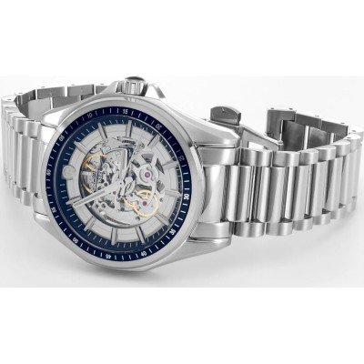 This Roamer watch has a case made of stainless steel with a diameter of 44 mm and is fitted with a stainless steel band. Inside the case lies a Soprod movement and the watch features a Sapphire crystal.