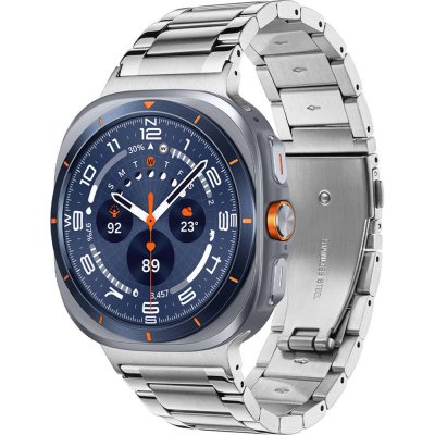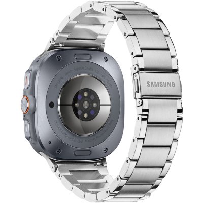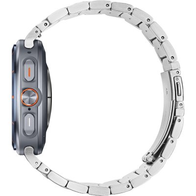 This Samsung watch has a case made of titanium with a diameter of 47 mm and is fitted with a stainless steel band.