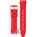 This Swatch watch strap is made of silicone and is attached to the watch by means of steel pins. The band has a width of 19.8 mm and is closed by means of a buckle. The strap has no straight mount which means that this strap is only suitable for the watches listed below.