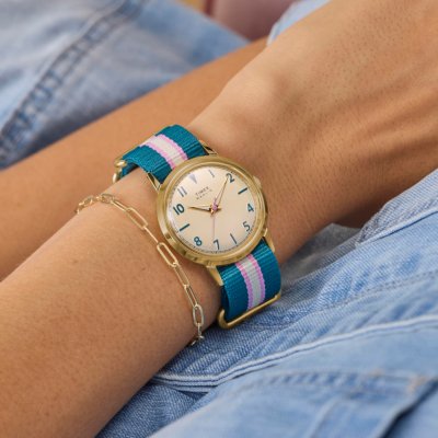 This Timex watch has a case made of stainless steel with a diameter of 34 mm and is fitted with a textile band. Inside the case lies a Timex movement and the watch features a Acrylic crystal.