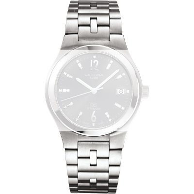 Esta bracelete de relógio Certina é feita de titânio e está fixada ao relógio através de pinos em aço. A bracelete tem uma largura de 22 mm e fecha através de fivela dobrável. A bracelete não tem uma montagem a direito, o que significa que esta bracelete só é adequada para os relógios listados abaixo.