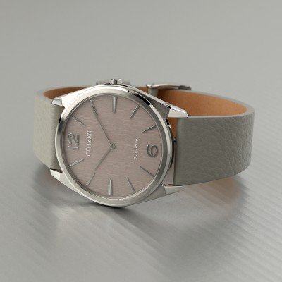 Este relógio Citizen tem uma caixa de Inox com um diâmetro de 38.4 mm e está equipado com uma bracelete de couro. A caixa possui um movimento Citizen e o relógio tem um vidro Safira.