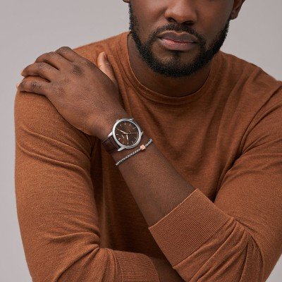 Este relógio Fossil tem uma caixa de Inox com um diâmetro de 44 mm e está equipado com uma bracelete de couro. A caixa possui um movimento Seiko Instruments Inc. e o relógio tem um vidro Mineral.