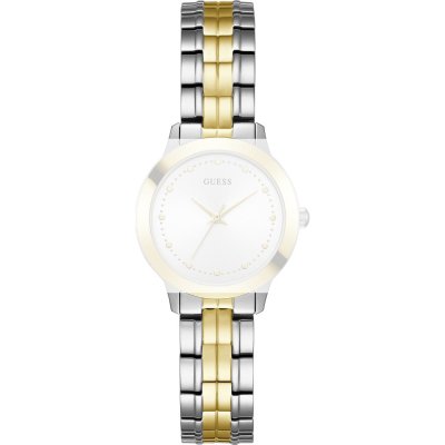Esta bracelete de relógio Guess é feita de metal e está fixada ao relógio através de pinos de pressão. A bracelete tem uma largura de 14 mm e fecha através de fivela dobrável com botões de pressão. A bracelete não tem uma montagem a direito, o que significa que esta bracelete só é adequada para os relógios listados abaixo.