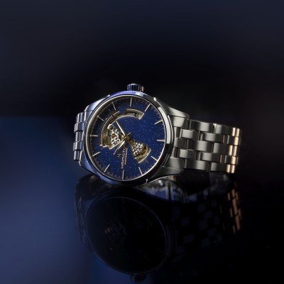 O Hamilton Jazzmaster Open Heart é mais do que um simples relógio. Oferece um vislumbre do seu funcionamento interno. A estrutura do deslumbrante mostrador azul meia-noite é inspirada na pedra preciosa aventurina. O azul profundo e o efeito cintilante e reluzente criam uma aparência hipnotizante, atraindo o olhar para o movimento. A placa de base do movimento automático H-10 com 25 jóias e 80 horas de reserva de marcha foi cuidadosamente esqueletizada e decorada com um padrão de perlage. O movimento é visível através das aberturas no mostrador e é complementado por ponteiros e índices Dauphine de corte nítido. A caixa e a bracelete têm um acabamento escovado com rebordos polidos de alto brilho.