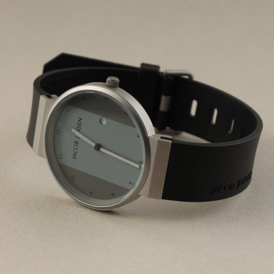 Este relógio Jacob Jensen tem uma caixa de Inox com um diâmetro de 35 mm e está equipado com uma bracelete de borracha.