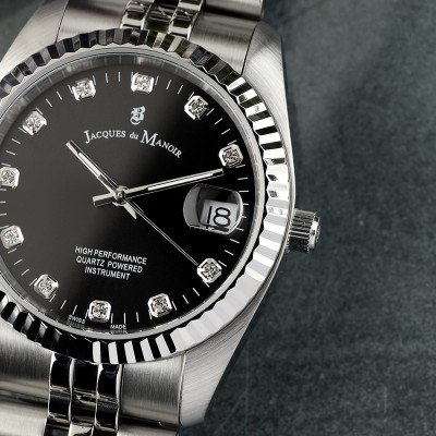 Este relógio Jacques du Manoir tem uma caixa de Inox com um diâmetro de 36 mm e está equipado com uma bracelete de Inox. A caixa possui um movimento Ronda e o relógio tem um vidro Mineral.