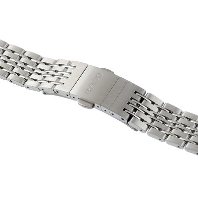 Esta bracelete de relógio Rado é feita de aço inoxidável e está fixada ao relógio através de pinos de pressão. A bracelete tem uma largura de 16 mm e fecha através de fivela dobrável com botões de pressão. A bracelete não tem uma montagem a direito, o que significa que esta bracelete só é adequada para os relógios listados abaixo.