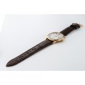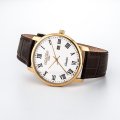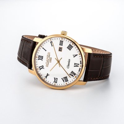 Este relógio Roamer tem uma caixa de Inox com um diâmetro de 40 mm e está equipado com uma bracelete de couro. A caixa possui um movimento Ronda e o relógio tem um vidro Safira.