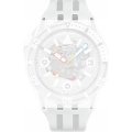 Esta bracelete de relógio Swatch é feita de silicone e está fixada ao relógio através de pinos em aço. A bracelete tem uma largura de 26 mm e fecha através de fecho. A bracelete não tem uma montagem a direito, o que significa que esta bracelete só é adequada para os relógios listados abaixo.
