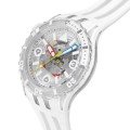 Este relógio Swatch tem uma caixa de Plástico de origem biológica com um diâmetro de 44 mm e está equipado com uma bracelete de borracha. A caixa possui um movimento ETA e o relógio tem um vidro Acrílico.
