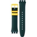 Esta bracelete de relógio Swatch é feita de plástico de origem biológica e está fixada ao relógio através de pinos em aço. A bracelete tem uma largura de 19.7 mm e fecha através de fecho. A bracelete não tem uma montagem a direito, o que significa que esta bracelete só é adequada para os relógios listados abaixo.