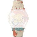 Esta bracelete de relógio Swatch é feita de resina e está fixada ao relógio através de pinos em aço. A bracelete tem uma largura de 19.7 mm e fecha através de fecho. A bracelete não tem uma montagem a direito, o que significa que esta bracelete só é adequada para os relógios listados abaixo.