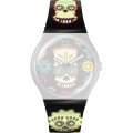 Esta bracelete de relógio Swatch é feita de silicone e está fixada ao relógio através de pinos em aço. A bracelete tem uma largura de 19.7 mm e fecha através de fecho. A bracelete não tem uma montagem a direito, o que significa que esta bracelete só é adequada para os relógios listados abaixo.