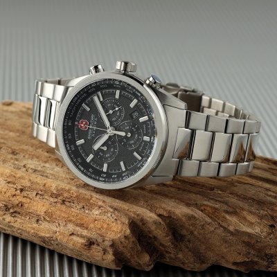 Este relógio Swiss Military Hanowa tem uma caixa de Inox com um diâmetro de 43 mm e está equipado com uma bracelete de Inox. A caixa possui um movimento Ronda e o relógio tem um vidro Safira.